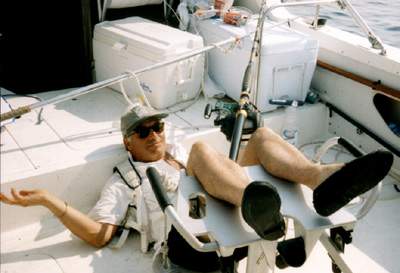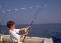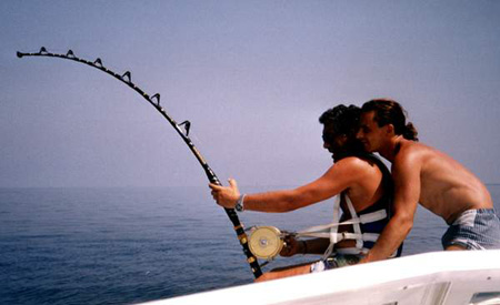 Andrea al timone della mia barca, non si e' minimamente preoccupato se mi fossi fatto male o meno: ha subito afferrato la macchina fotografica ed ha scattato. Canna Normic 80 lb. mulinello Shimano. |