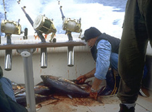 Nel caso di pesci di pezzatura modesta come le Alalunghe pescate a traina, non e' possibile rilasciarle. Queste vengono catturate con lenza la 8/12 lb. ed artificiali Rapala Magnum da 11/13 centimetri. Le due ancorette si configgono profondamente all'interno e all'esterno del pesce che viene salpato. Unico sistema per dare poco danno e' l'autolimitazione nelle catture e sopratutto l'utilizzo di lenze sottili. |